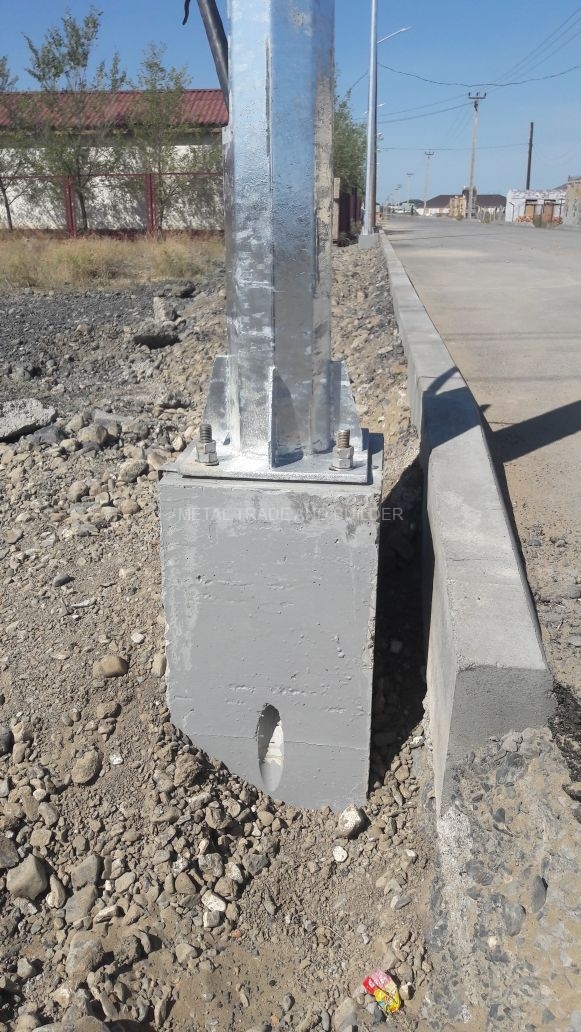 Фундамент для опор освещения типа Ф изготавливается из тяжелого бетона в опалубках с применением вибрационного метода уплотнения. Фундаментный блок состоит из закладной детали надежно замоноличенной в бетонное основание, для подводки подземного кабеля фундамент имеет закладные трубы, закрепления стойки осуществляется при помощи закладных анкерных шпилек.